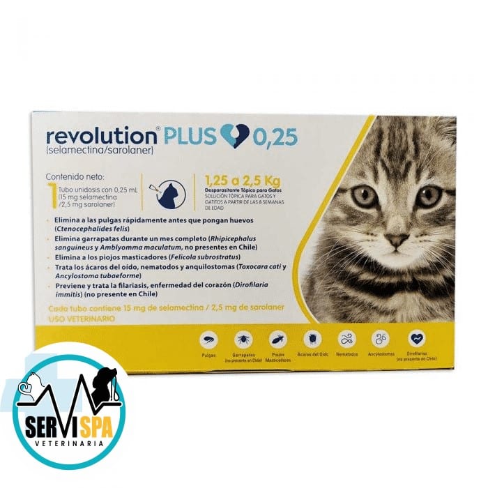 Tratamiento de infestaciones por pulgas (Ctenocephalides felis), tratamiento de infestaciones por garrapatas (Rhipicephalus sanguineus, Amblyomma maculatum, Dermacentro variabilis, Dermacentor reticulatus, Ixodes ricinus, Ixodes hexagonus), así como tratamiento de infestaciones por piojos masticadores (Felicola subrostratus).